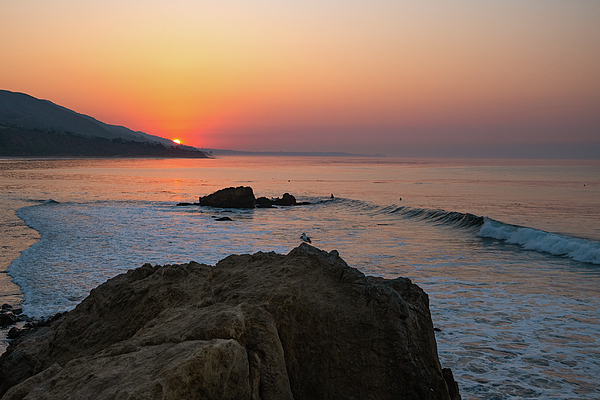 The rising sun peaking over the Santa Monica Mountains on a warm summer day at Leo Carrillo State Beach near Malibu, California. Early morning surfers catching the first waves of the day with the seagull looking on.