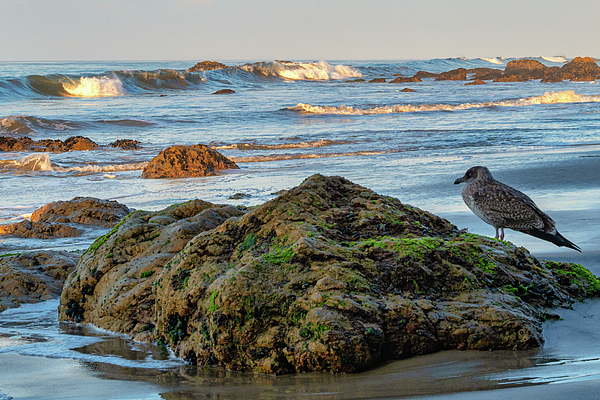 A bird enjoying the early morning view of the crashing surf at El Matador State Beach in Malibu, California.