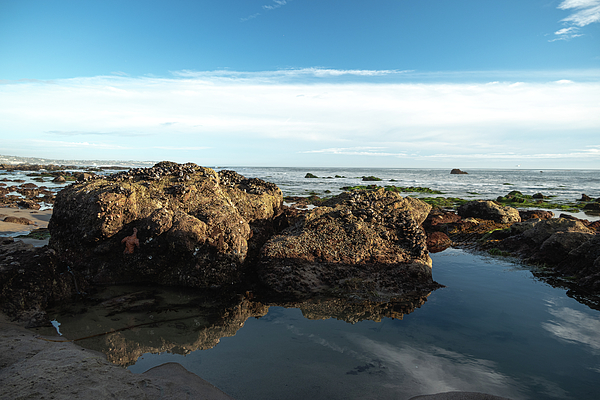 Two rocks at low tide beside a tide pool at low tide. Notice the starfish clinging to the rock on the left. Photo taken at El Pescadore State Beach in Malibu, California on a winter afternoon.