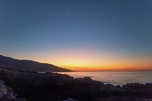 Shortly after sunrise, the crescent moon drifts higher into the sky over the California coast.