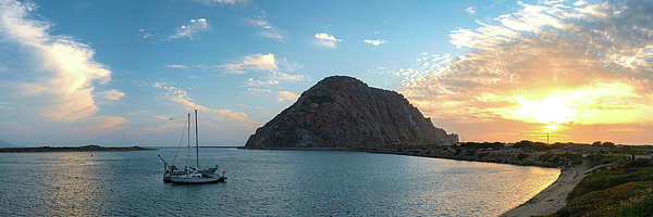 A panoramic view of a colorful springtime sunset in Morro Bay, California with a view of Morro Rock and the harbor.