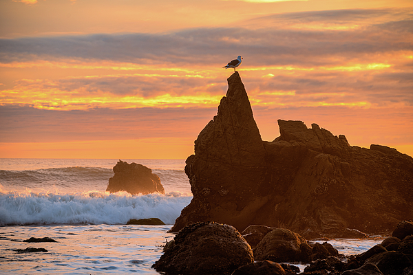 A seagull enjoying a winter sunset from atop an offshore rock in Malibu, California. The crashing waves and colorful sky add to the beauty of this photo.