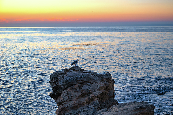 A lone seagull enjoying a quiet morning with a sunrise view over the ocean in Malibu, California.