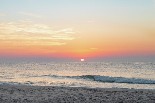 The calm morning waves breaking as the sun rises over the hiorizon on a summer morning on the Jersey Shore.