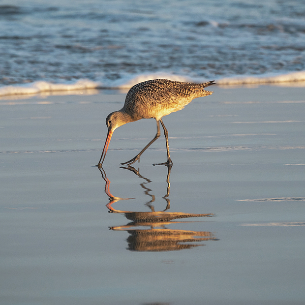 A long-billed curlew foraging for food in the wet sand at Morro Strand State Beach in Morro Bay, California. The long-billed curlew is a large North American shorebird of the family Scolopacidae. This species was also called "sicklebird" and the "candlestick bird".