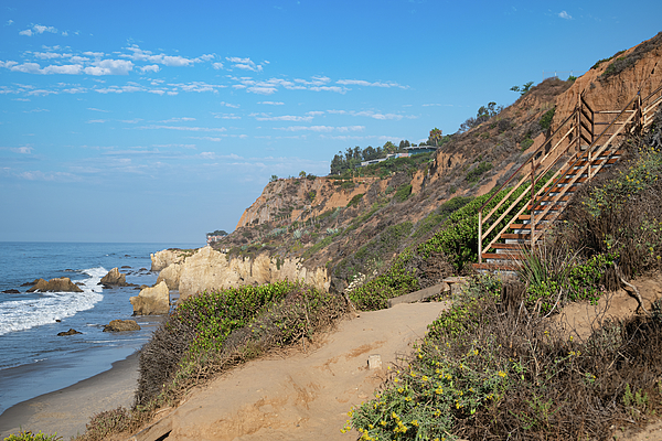 The path down to the beach at El Matador State Beach is a steep trail with several staircases offering sweeping views of the coastline in Malibu, California.