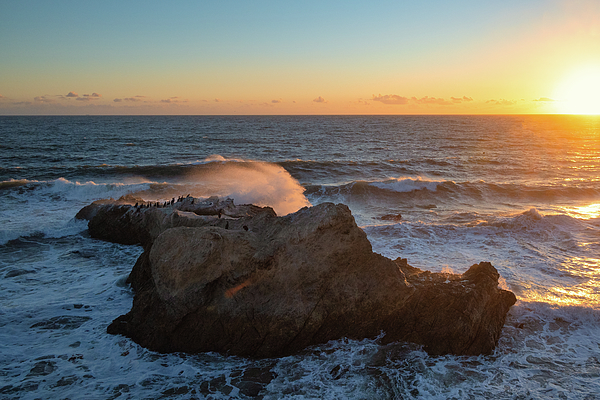 The perfect combination of the setting sun, waves crashing over the rock and birds at Leo Carrillo State Beach near Malibu, California.