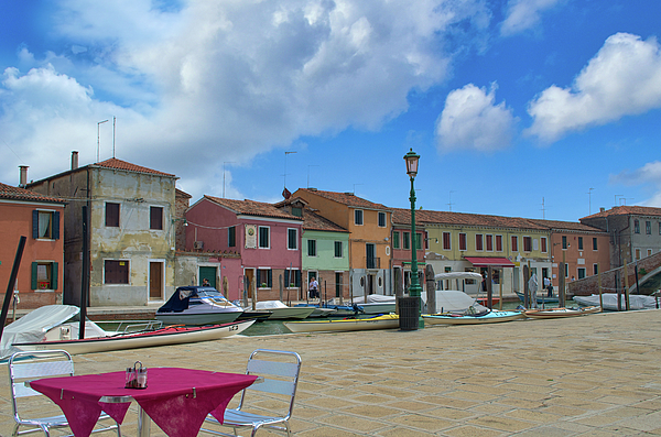 Queen duvet cover (88" x 88") featuring the image "Table for Two in Murano" by Matthew DeGrushe. Our soft microfiber duvet covers are hand sewn and include a hidden zipper for easy washing and assembly. Your selected image is printed on the top surface with a soft white surface underneath. All duvet covers are machine washable with cold water and a mild detergent.
