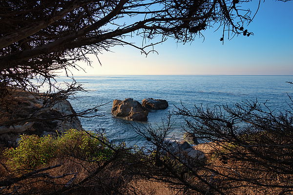 Looking from a vantage point behind the trees in Malibu, California you can see the large offshore rocks and the Pacific Ocean.